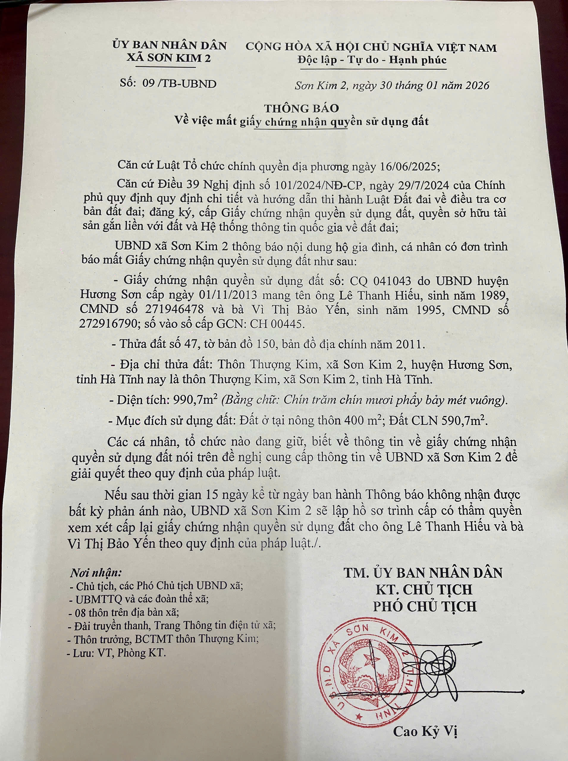 THÔNG BÁO VỀ VIỆC MẤT GIẤY CHỨNG NHẬN QUYỀN SỬ DỤNG ĐẤTẨn danh30/01/2026A -A+Ẩn danh30/01/2026A -A+File đính kèmG.jpg